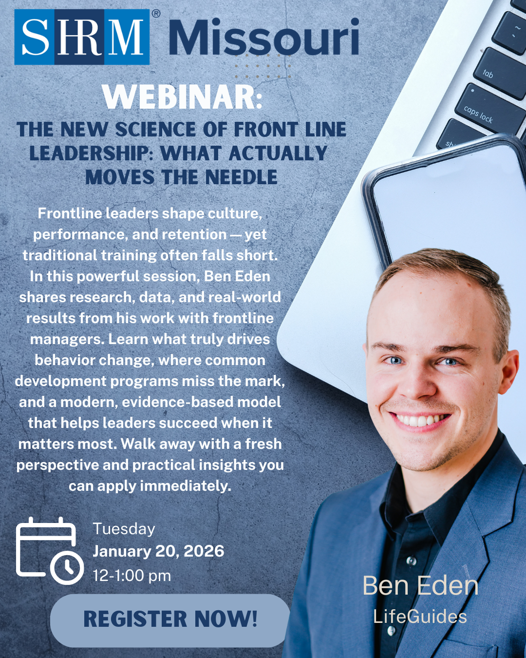 | | Join MOSHRM for this FREE webinar featuring Ben Eden of LifeGuides, focused on what truly drives effective frontline leadership. This session offers a research-backed perspective and practical takeaways HR professionals and people leaders can apply immediately to support stronger leadership outcomes. | | |