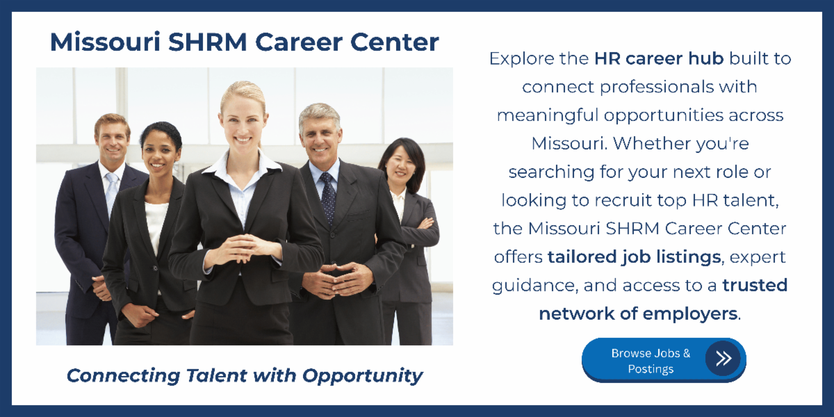| | | Join West Central Missouri SHRM on September 9th for “The Ethics of Personnel Records,” presented by Sydney Wilson. This session will share best practices for managing employee files from onboarding through offboarding, helping HR professionals strengthen compliance, improve record management, and reduce risk. | | | Join us for the SHRM-KC Annual Conference being held on Thursday, November 6, 2025 at the Grand Street Café on the Plaza. This year's conference will feature five sessions covering all things HR! Packed with networking opportunities and a robust business partner expo, this conference is sure to help you stay on top of the present and future world of work. All sessions will be pre-approved for SHRM and HRCI. Register early to reserve your spot! | | | | | Stay Connected with Missouri State Council of SHRM | | | | |