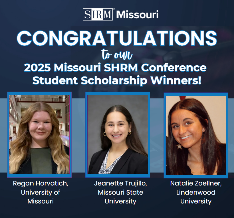 We were proud to welcome our Student Scholarship award winners to the 2025 Missouri SHRM Conference, Regan Horvatich (University of Missouri), Jeanette Trujillo (Missouri State University), and Natalie Zoellner (Lindenwood University).