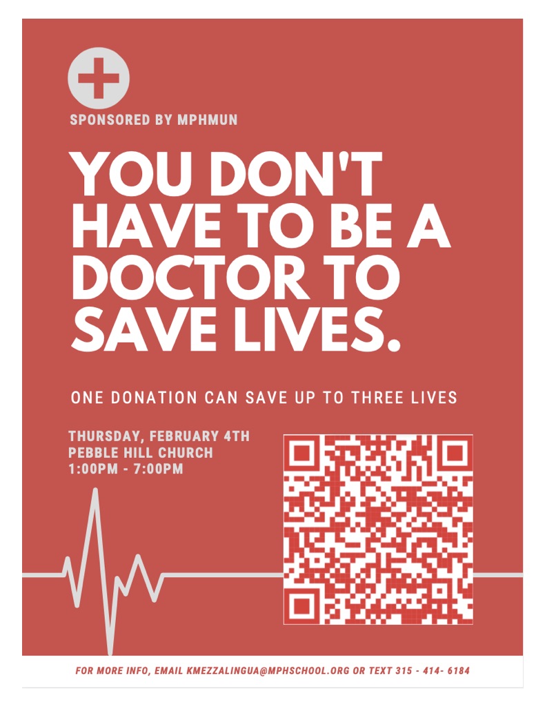 This Thursday, February 4, the MPHMUN team will host a blood drive at the Pebble Hill Church (across the street from campus). Time slots are available from 1:00 to 7:00 p.m. To register, simply scan the QR code on the poster, or visit the website here.