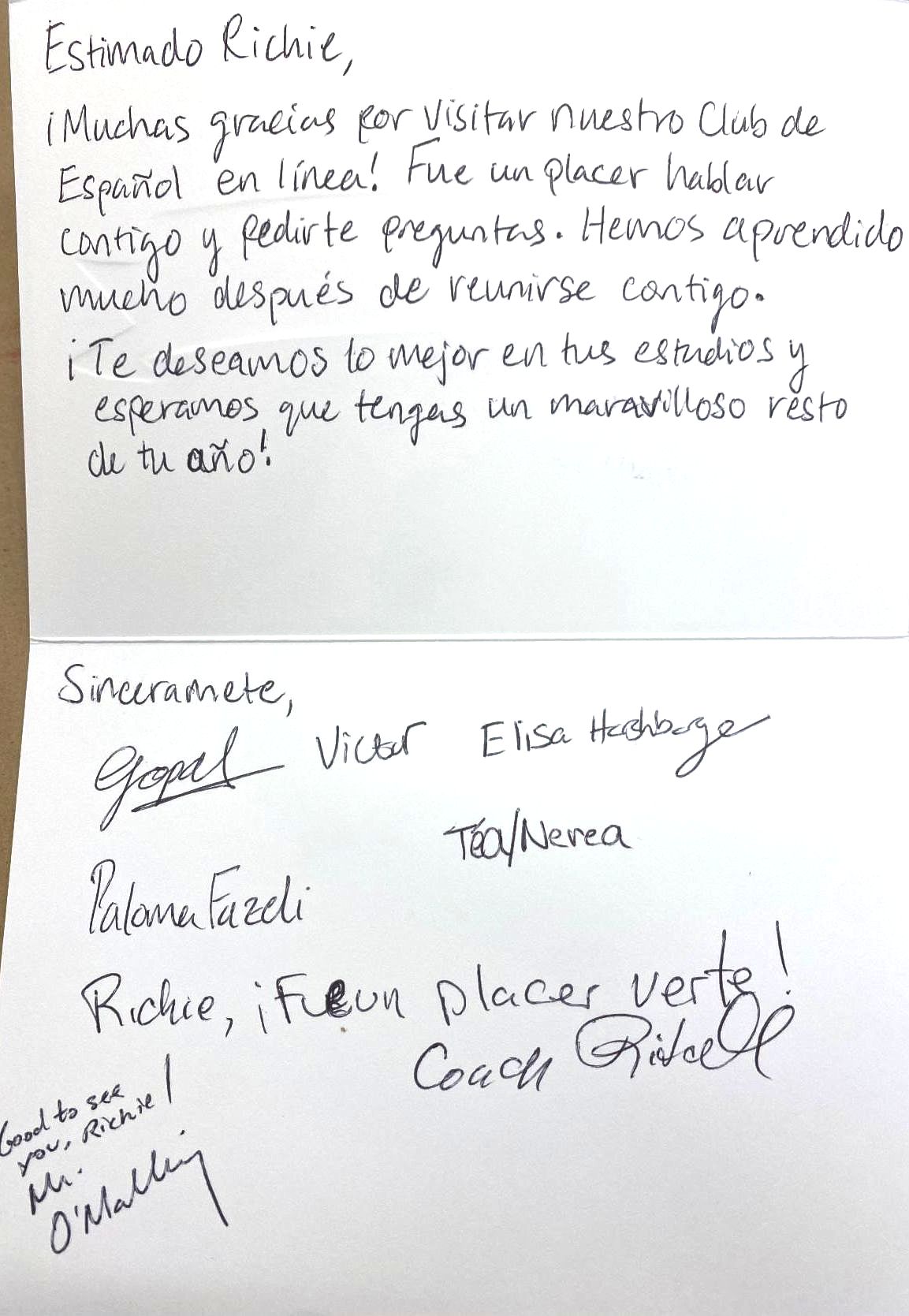 Last Wednesday, the MPH Club de Español (Spanish Language and Culture Club) met with a special guest over Zoom. The club members had the opportunity to ask Ricardo (Richie) Medina, a current university student who grew up in Mexico, many questions about the cultural differences he has observed, as well as facts about his day-to-day life. In this meeting, students were given a marvelous opportunity to practice and strengthen their Spanish-speaking skills, and they wanted to express their gratitude to Richie with a thank-you card (seen in the images below).