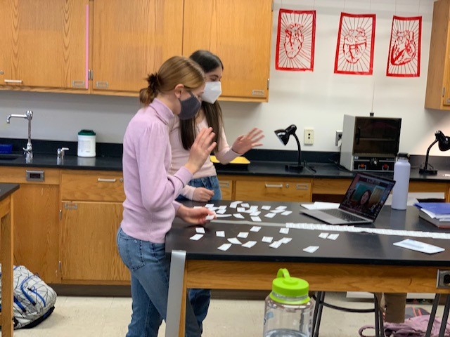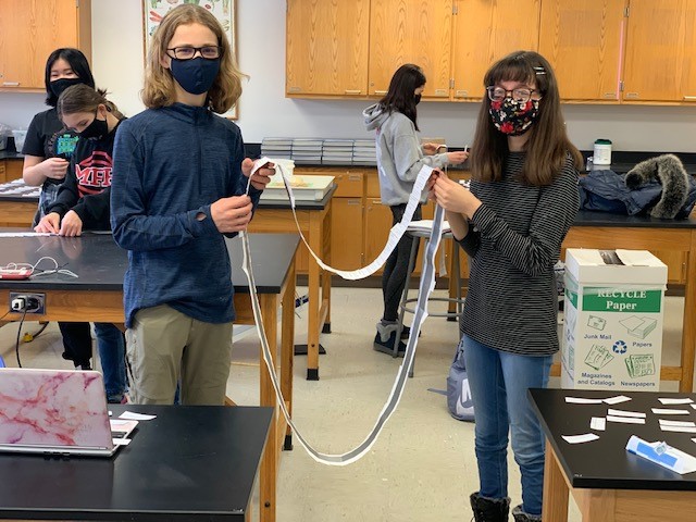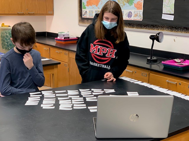 Pairs of 8th and 9th graders worked on “loops” in Geometry AC this week using more than 90 vocabulary words, theorems, and postulates. Here's how it works: There are cards containing questions and answers. A student picks one at random and asks the question. Everyone in the group decides on the answer, finds the card with that answer on it, and attaches it to the question card with tape. Then, a new question card is read and the hunt is on for the next answer. If done correctly, all cards will be used and the answer to the last question will be on the first card used, hence the “loop.” Take a look below!