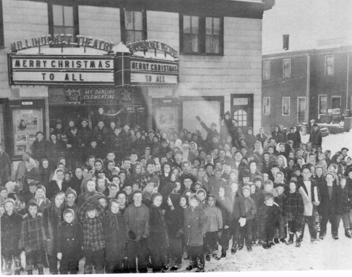 A crowd of Millinocket children is seen gathered at the Millinocket Theater on Penobscot Avenue for a movie afternoon or a special holiday presentation. Special matinees for the Christmas season were common. The theater, owned and managed by the LePage family, opened in 1938 and ran until 1962.