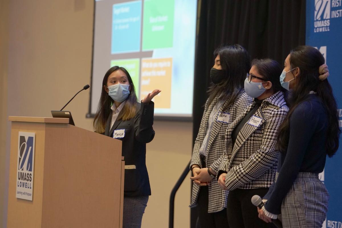 Team Simplicity Bank makes their pitch to the judges. From left: Monica Nguyen, Saema Nazar, Heer Patel, and Yeaharne Hout.