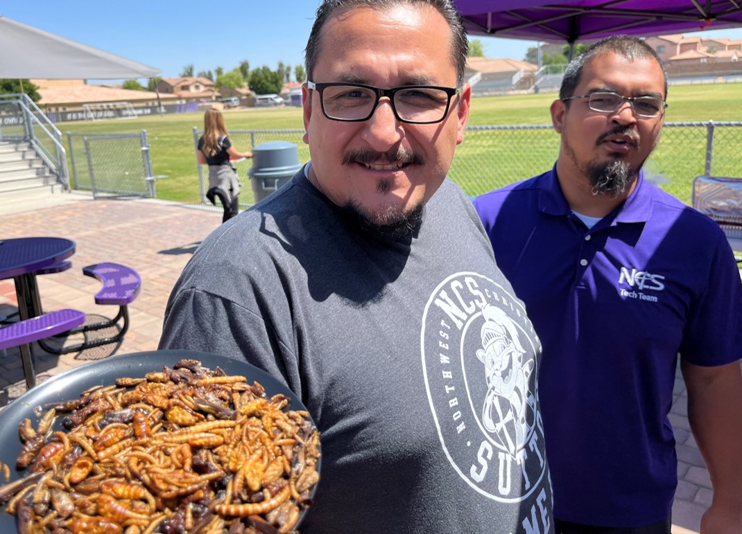 You call this 'teacher appreciation'? The final full week of April did double-duty on the Northwest Christian campus as it represented both Faculty and Staff Appreciation Week as well as the "season finale" of the yearlong cooking competition, the Great Crusader Cook-Off. The competition has raged since August between the four divisions of the school: Early Ed, Elementary, Middle School, and High School. Each month, teachers and staff have entered their own recipes for possible cash prizes and points that led up to a year-ending cash bonus for one of the divisions. During Faculty and Staff Appreciation Week, each day teachers also participated in "food"-based competitions, including, as seen here, the opportunity to eat edible bugs--worms, cicadas, beetles, ants, scorpions, and tarantulas--for points towards that year-ending prize.