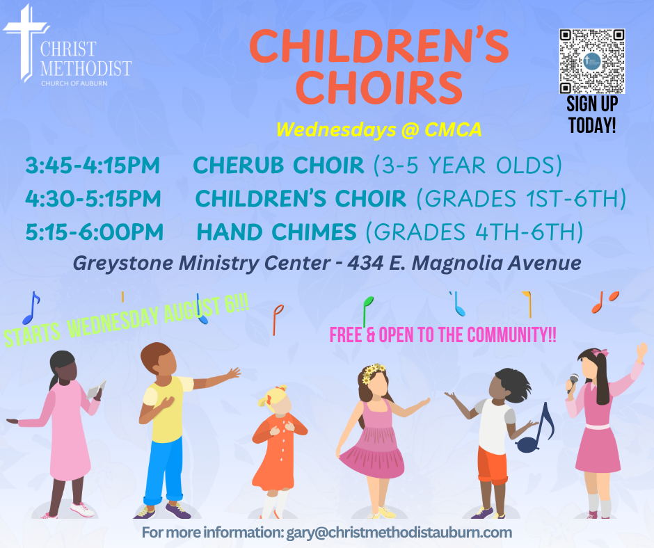 Our children's choirs resume this Wednesday, August 6th, at Greystone. Help give your child the gift of music and further their love for scripture and leading in worship.