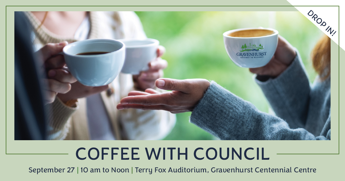 Coffee with Council will take place in the Terry Fox Auditorium at the Gravenhurst Centennial Centre from 10 a.m. to noon. People are welcome to drop in at any point during the session.