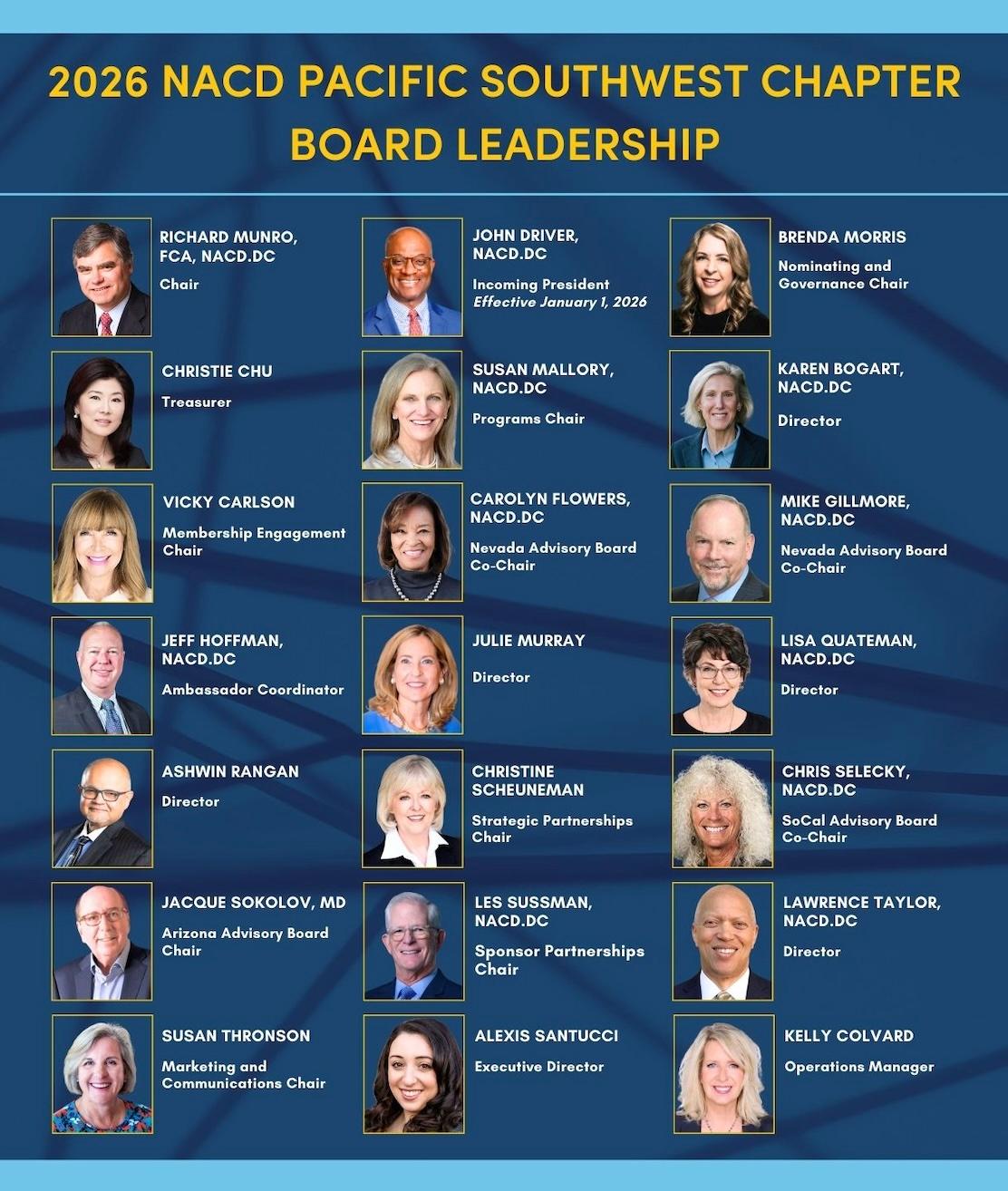 Our Chapter board continued to support NACD PSW’s high level of activity in 2025 delivering 35 NACD credit granting programs, overachieving our 2025 goals with NACD, and new initiatives to expand our reach and awareness in the business communities of Nevada, Arizona, and Southern California. I want to warmly thank and acknowledge all of our board members for their contributions to our success.