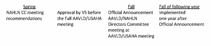 NAHLN Laboratories must complete the Laboratory Assessment Matrix (LAM) each fall providing specific information regarding the laboratory’s capability and capacity to support the NAHLN. The NAHLN Program office reviews, verifies, and uses the information collected on the LAM to determine NAHLN laboratory designation and infrastructure funding. The LAM is reviewed every 2 years but may be modified more often if a critical need is identified. With input from the NAHLN Coordinating Council, APHIS and NIFA have developed a timeline for communicating and implementing any approved changes to the LAM. The approved changes will be in effect during the laboratory assessment for a minimum of 12 months after the date of approval. All changes will be communicated officially at the AAVLD/NAHLN Laboratory Directors Committee meeting during the annual AAVLD/USAHA meeting.