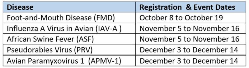 Laboratories may participate once they are approved to test and have been vetted to message for the disease. To date, 43 laboratories are approved to message for at least one disease. Since these events began in late March, the NAHLN Program Office has completed eight competencies, with three more in process. Competencies are available for ASF, APMV-1, IAV-A, Influenza A Virus of Swine (IAV-S), FMD, PRV, and Vesicular Stomatitis Virus (VSV).