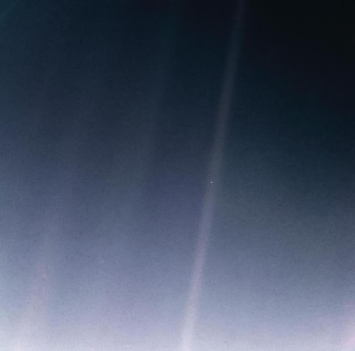 35 years ago today, NASA’s Voyager 1 spacecraft was speeding out of our solar system when mission managers instructed it to look back one final time before turning off its cameras forever. One of the images it took was this one of Earth as seen from a distance of billions of miles away. The image was later dubbed “The Pale Blue Dot” inspired by the title of a book written by Carl Sagan | |