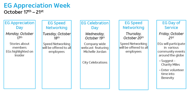 DE&I is hosting EG Appreciation Week. Here are the details and reach out to your Regional Chapters to see how you can engage in these activities. | |