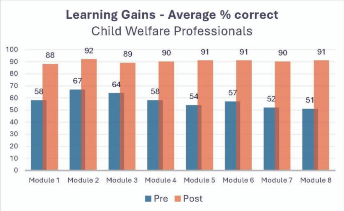 NTI participants take a pre-test and a post-test for each module. As seen in the charts, participants in all curricula show learning gains in every module. These data show the ongoing need for the NTI training and the learning that takes place. The growth in knowledge and skills demonstrates NTI is addressing much-needed training topics and has the ability to build capacity within these workforces in these areas.