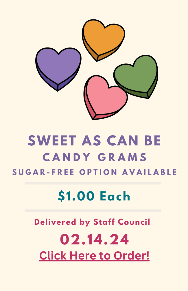Scan the QR code or click the button below by February 12th to send a Crush to your crush. Pick up Wednesday, Feb 14th in the UC Lobby between 12pm and 2pm