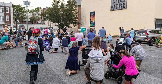 Marchers knelt or stood beside SsAM's Black Lives Matter