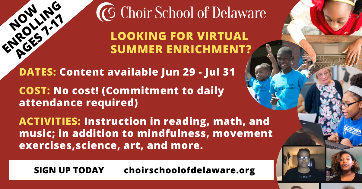 The Choir School of Delaware is excited to announce its 2020 Summer Program with SummerCollab, the United Way of Delaware’s After School Network, the Wilmington Public Library and Delaware Shakespeare!