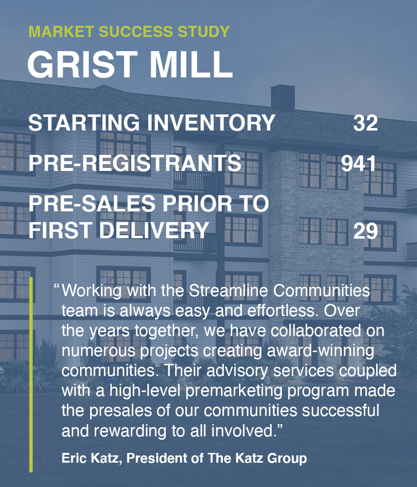 Streamline's pre-marketing program is designed to generate buyer (and rental) prospects before and during the construction process. Over the course of 9 months Streamline Communities' marketing and sales team was able to pre-register qualified prospects to the Grist Mill community using a mix of marketing tools including 3D digital renderings, virtual tours, advertising, signage, websites, and social media.
