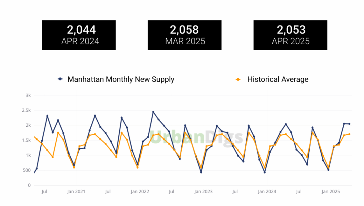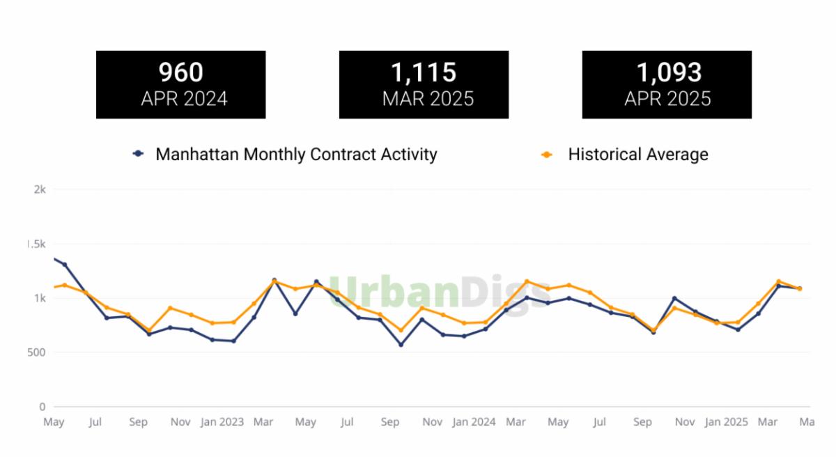 Since the administration’s tariff announcements on April 2nd and the ensuing macroeconomic and financial developments, our clients have been asking more than ever: ‘How is the NYC real estate market?’. The short answer is that although it’s too early to predict where dynamics will ultimately settle, April 2025’s performance was largely unchanged from the month prior. There was a marginal decline in both new listings (down 0.2% from March 2025) and contracts signed (down 2% from March 2025). Though the number of contracts signed in April 2025 was slightly lower than the prior month, it was still ~14% higher than April 2024.