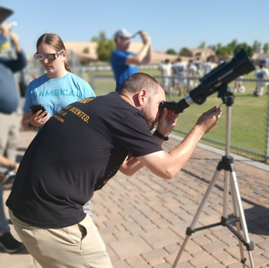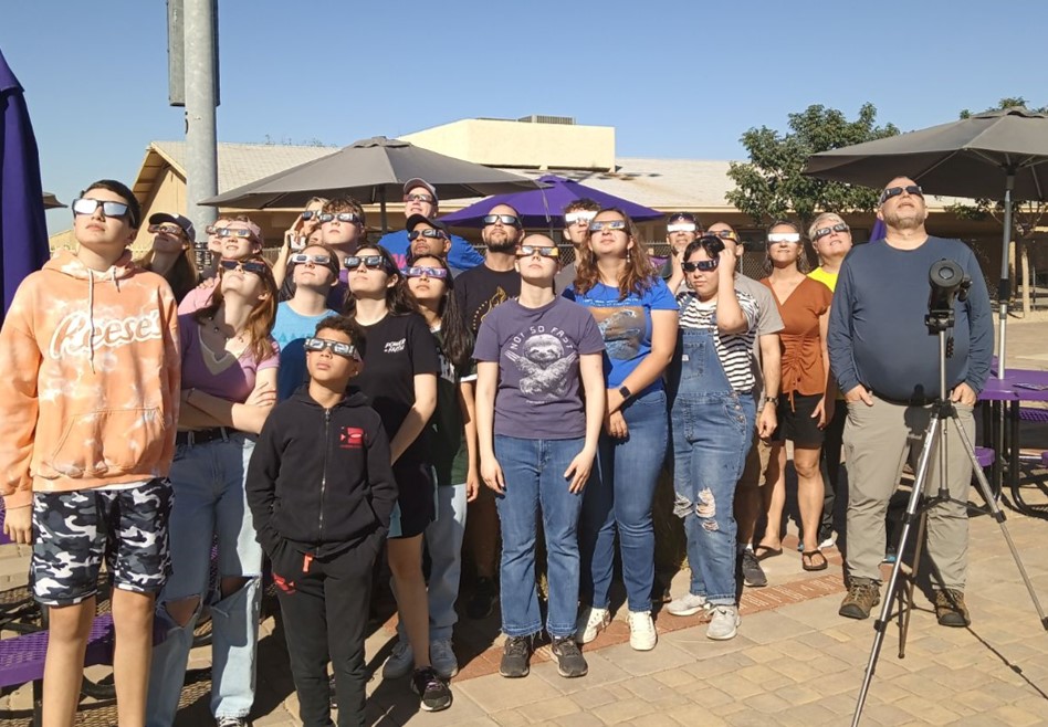 School on Saturday? Yep! On Saturday, October 14th, the Adventure Cru came to campus and enjoyed what astronomers labelled the "ring of fire eclipse". Using the school's telescope and individual glasses make for solar viewing, Mr. Bret Irwin facilitated a viewing party during which students watched as the moon passed between the earth and the sun, allowing for a shadow to be cast over portions of North America, including a corner of Arizona. The relative distance of the three celestial bodies meant that the Adventure Cru had a memorable view of the sun's outer edges ringing the moon.