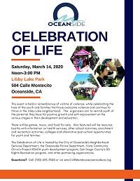 The Oceanside Neighborhood Services Department and the Oceanside Police Department invite you to join us at the Celebration of Life event at Libby Lake Park on Saturday, March 14 from noon to 3:00 p.m. This annual event is held in remembrance of victims of violence, while reminding youth of the potential for positive growth and offering enrichment activities, educational opportunities, and more.
