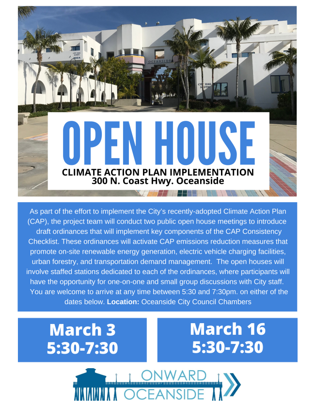 As part of the effort to implement the City’s recently-adopted Climate Action Plan (CAP), the project team will conduct two public open house meetings to introduce four draft ordinances that will implement key components of the CAP Consistency Checklist. These ordinances will activate CAP emissions reduction measures that promote on-site renewable energy generation, electric vehicle charging facilities, urban forestry, and transportation demand management (TDM). The open house meetings will involve staffed stations dedicated to each of