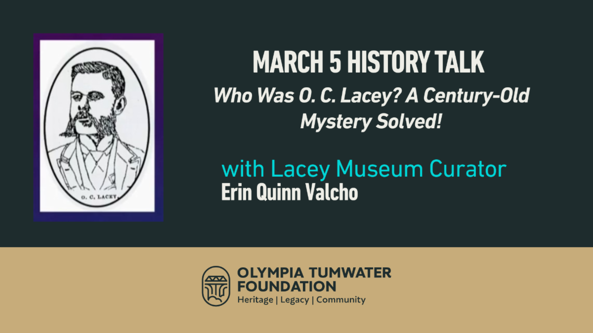 Join us at noon on Thursday, March 5, for a fascinating presentation by Lacey Museum Curator Erin Quinn Valcho: “Who Was O. C. Lacey? A Century-Old Mystery Solved!”