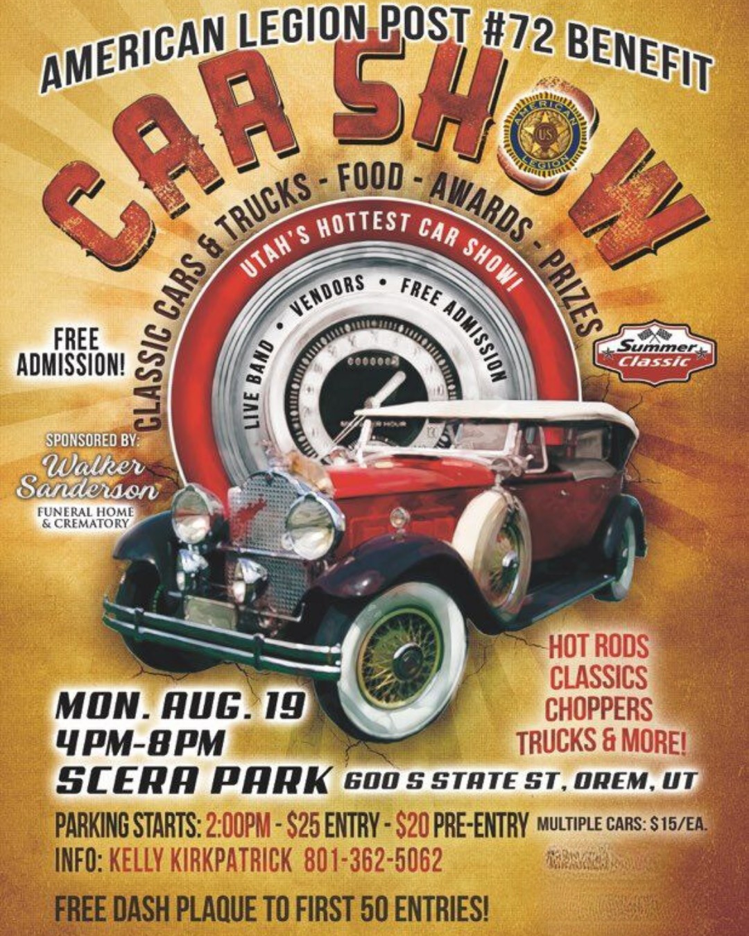 I’m excited to share that the Orem’s own American Legion Post 72 is hosting a benefit Car Show on Monday, August 19th from 4-8 PM at Scera Park in Orem. This event will be filled with awards, prizes, food trucks, live music, and a whole lot of fun for the entire community!
