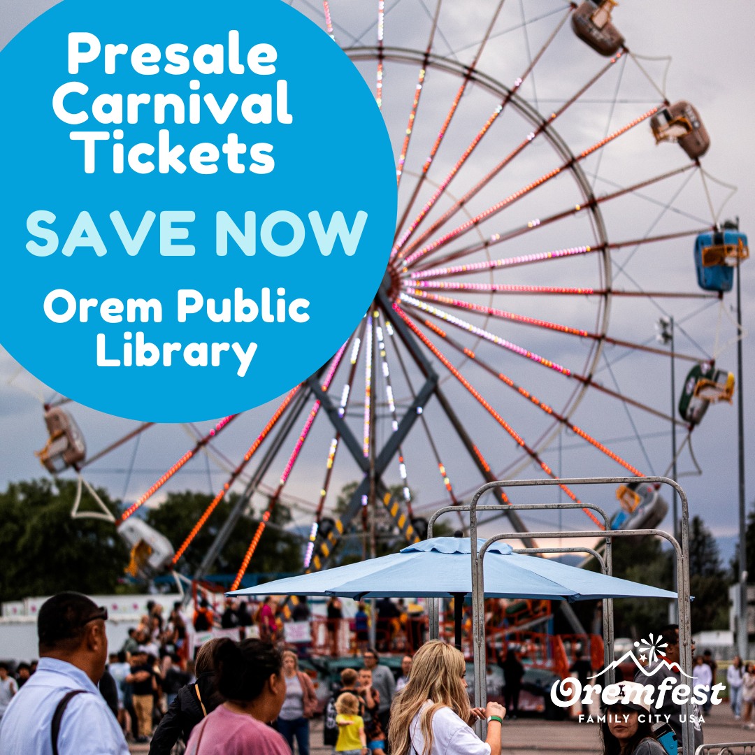 Get your unlimited carnival ride wristbands before Oremfest to skip the ticket lines and save some money at the same time. Vouchers for wristbands are now on sale at the Orem Public Library. Presale price is $30 but it will be $40 during the carnival.