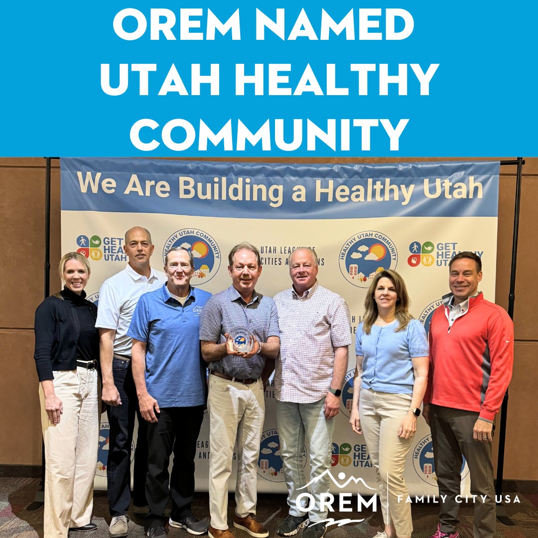 Orem was just named a Utah Healthy Community by Get Healthy Utah and the Utah League of Cities and Towns. This designation recognizes communities across Utah that do an exemplary job of implementing evidence-based strategies to improve community health. Mayor Young, Council members Jenn Gale, Jeff Lambson, Tom Macdonald, David Spencer, LaNae Millett, and City Manager Brenn Bybee received the award on the city's behalf.