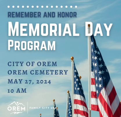 The annual Memorial Day program will be held on Monday, May 27th at 10am in the Orem City Cemetery. We hope you can join us as we honor and remember those who served our national so valiantly. There will be special music provided by the Utah Baroque Ensemble as well as a keynote address by local war hero Jack Rhodes. | |