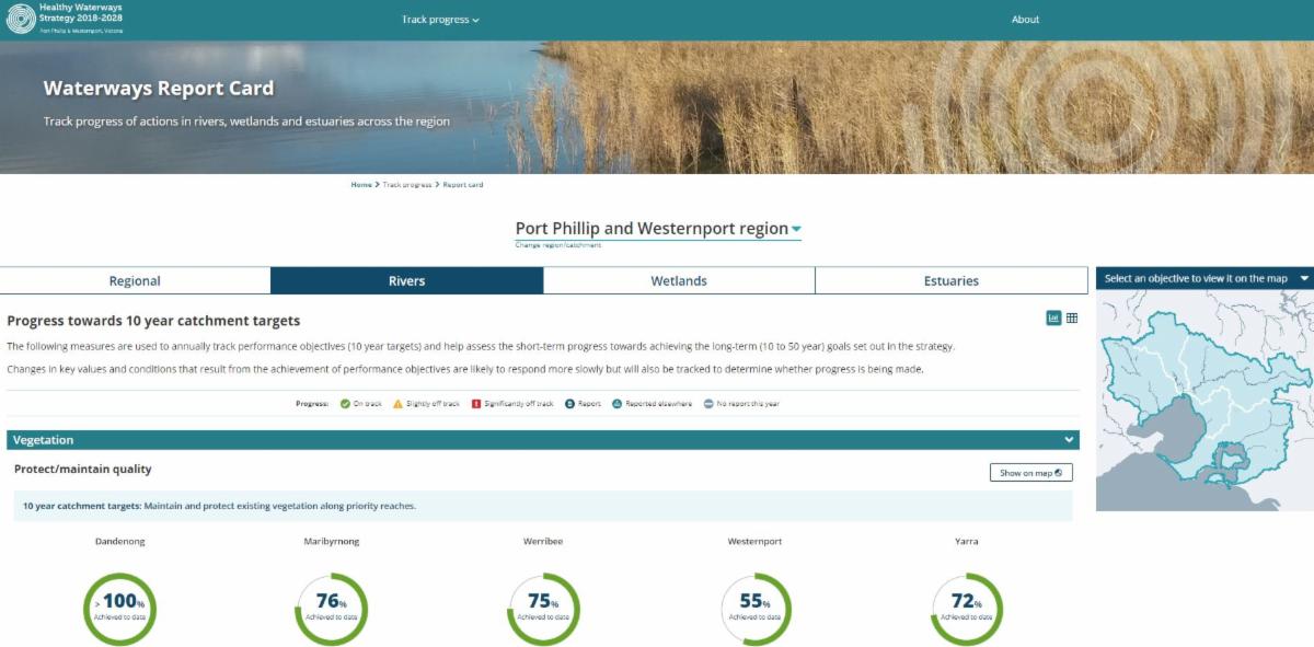 Melbourne Water has released for the first time an interactive report card as part of the Healthy Waterways Strategy 2018-2028. The strategy was developed with over 220 contributing organisations, setting a shared vision for the health of rivers, estuaries and wetlands in the Port Phillip and Westernport region over the next decade. The report card is allowing transparent tracking of the performance objectives, vegetation targets, stormwater harvesting and waterway related activities for each of the five Co-designed Catchment Programs for Werribee, Maribyrnong, Yarra, Dandenong, and Westernport. Some of the key findings of the latest report card include: