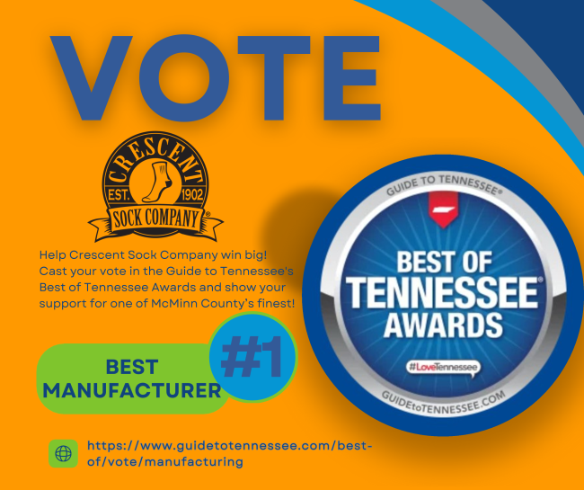 Crescent Sock Company is nominated for Best Manufacturer in the Guide to Tennessee’s Best of Tennessee Awards! Known for its innovation, craftsmanship, and commitment to community, Crescent represents the very best of Tennessee manufacturing. Let’s show our support and help them bring home the win—cast your vote today!
