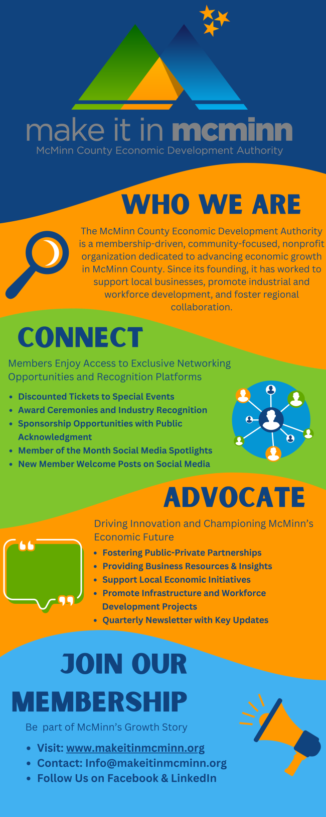 Are you interested in becoming a member of the McMinn County Economic Development Authority? We warmly invite and encourage all companies and individuals to join our dynamic community. Whether you're a large corporation, a small business, or an individual, there's a membership level perfectly suited for you! Don't miss out on these fantastic opportunities to connect, grow, and contribute to our community. Click the link to learn more about our membership options and apply today!