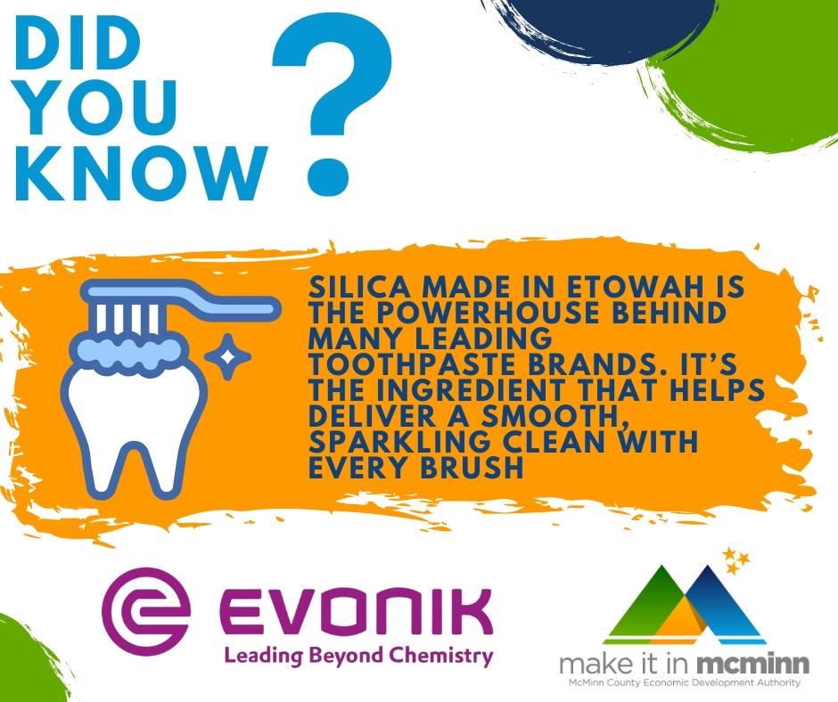 Did you know one of the key ingredients behind your healthy, radiant smile is made right here in McMinn County? Since 1963, Evonik Corporation’s Etowah facility has been producing high-quality silica — a vital component in toothpaste that helps keep our teeth clean, bright, and strong.