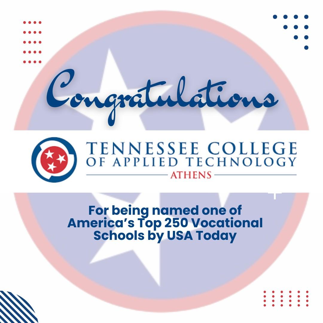 We’re proud to share that TCAT Athens has been named one of America’s Top 250 Vocational Schools by USA Today. This honor places TCAT Athens among 17 Tennessee Colleges of Applied Technology recognized for excellence in career and technical education. Tennessee ranked 4th nationally for the number of schools included—highlighting our state’s commitment to workforce readiness and skills-based training. Congratulations to TCAT Athens for representing McMinn County on the national stage!