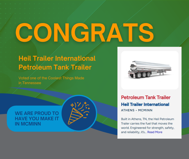 We're proud to share that Heil Trailer International earned a spot in the Top 16 of the statewide Coolest Thing Made in Tennessee competition! Their Petroleum Tank Trailer, known for its durability, innovation, and engineering excellence, stood out among hundreds of entries from across the state. This recognition highlights not only Heil’s commitment to quality and safety but also the strength of McMinn County’s manufacturing sector.