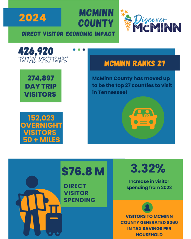 The county welcomed 263,404 visitors, whose spending resulted in an estimated $360 in tax savings per household. “Tourism continues to be a powerful economic driver for McMinn County,” said Lindsey Ferguson, Director of the McMinn County Economic Development Authority. “These numbers reflect the growing appeal of our community and the hard work of our local businesses and attractions.