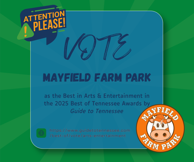 We’re excited to share that Mayfield Farm Park has been nominated for Best in Arts & Entertainment in the 2025 Best of Tennessee voting by Guide to Tennessee. This recognition celebrates the park’s commitment to creating unforgettable experiences for families across our region. Help us bring home the win by casting your vote and sharing with friends and neighbors who love Mayfield Farm Park as much as we do!