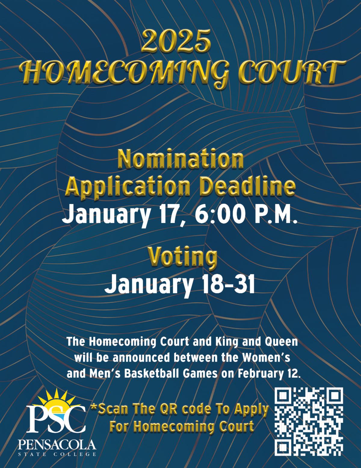 The 2025 Pensacola State College Homecoming Court nomination period ends this Friday, Jan. 17, at 6 p.m. Online voting opens at 8 a.m. on Saturday, Jan. 18, and is open to everyone, including students, staff, faculty, the public, and all supporters of PSC. The top five candidates will become members of the 2025 Homecoming Court. |