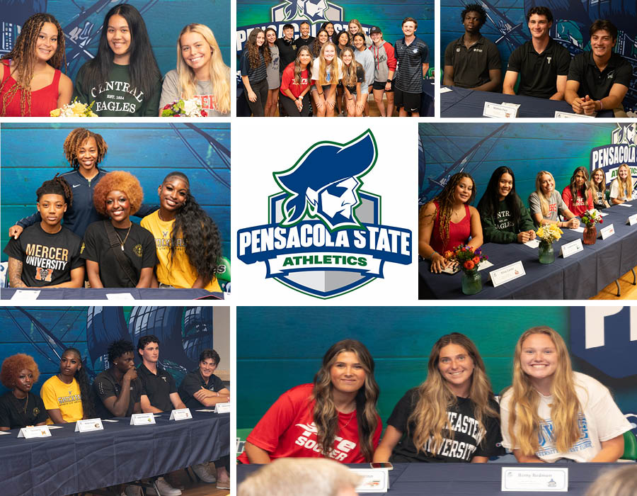 On April 28, thirteen PSC student-athletes signed letters of intent at four-year universities. Clockwise, from top left:Women’s Volleyball: Riley Carter – William Carey University; Jazmine Srun – Central Methodist University; and Cadence Goeden – University of West Alabama; Women’s Soccer team; Men’s Basketball and Men’s Baseball: Dimitri Clerc, basketball – University of Massachusetts; Matteo Pare, baseball – Troy University; and Mason Onate, baseball – Marshall University; Women’s Volleyball and Women’s Soccer soak in the spotlight; Women’s Soccer: Morgan Trombly – Southeastern University, Lakeland, FL; Jenna Maiorino – Southeastern University, Lakeland, FL; and Remy Redmon – University of West Florida; Women’s Basketball, Men’s Basketball and Men’s Baseball wait for the ceremony to begin; Women’s Basketball: With Coach Clenita “Penny” Belford, Talia Kemp – Mercer University; Katiya Casey – Emporia State University; and Jaida McDonald – Wichita State University. (Not pictured: Audreonia Benson – University of Central Florida). |