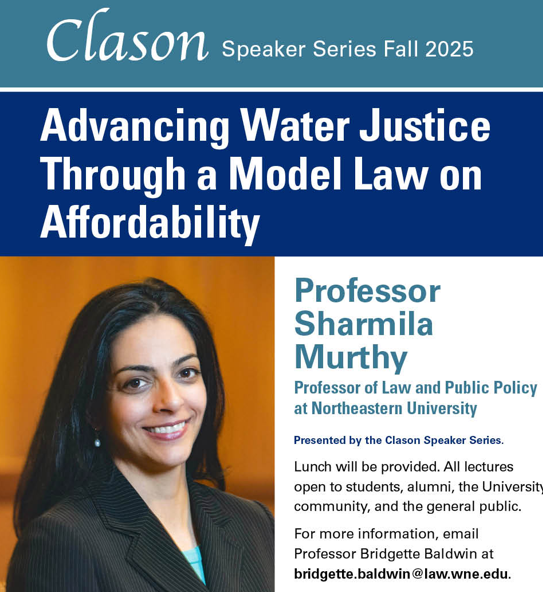 Prof. Sharmila Murthy spoke at the Northeastern School of Law on the increasing unaffordability of household water, which threatens basic water accesss for millions of Americans, and how state and local governments could modify their utility laws to overcome legal barriers to affordability.
