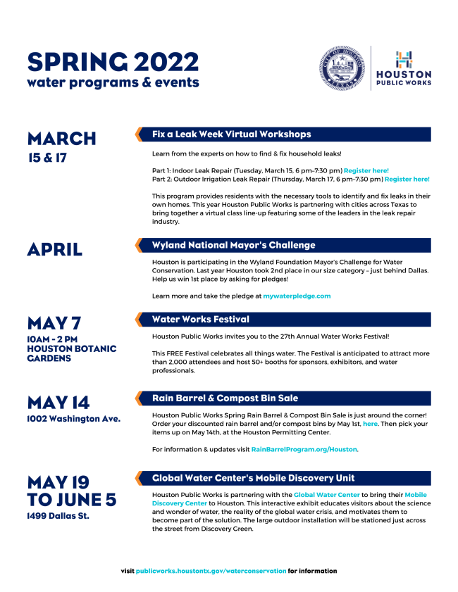 The city of Houston' Public Works department has several water programs and events taking place during the next few months. Take note and be sure to register.