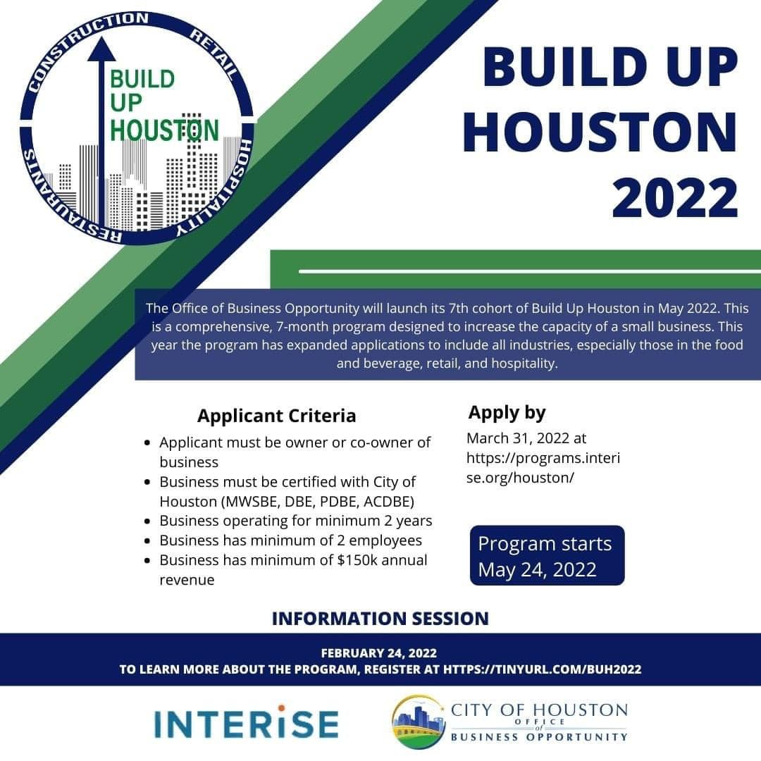 Applications are now being accepted for Build Up Houston 2022 by The Office of Business Opportunity. The deadline to apply is March 31st, and the program begins on May 24th. This is a seven-month program that helps small business owners increase in capacity. Business owners in all industries are welcomed to apply.