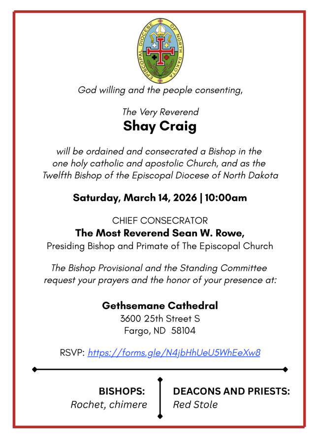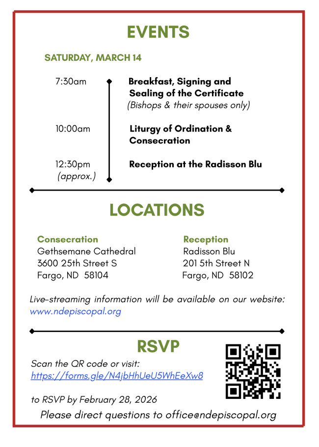 - February 19: Bishop's Consecration Hospitality Meeting (Zoom); 7:15pm