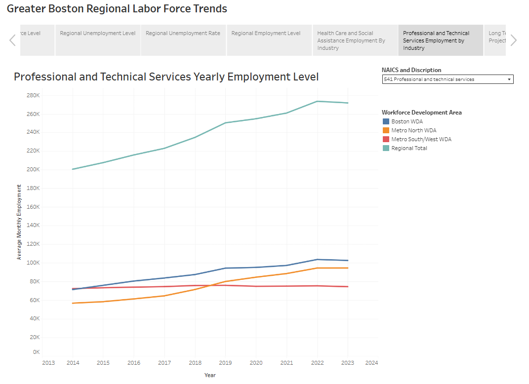 The dashboard is a visual representation of the publicly available data from the Massachusetts Department of Economic Research that underpins the Greater Boston Regional Planning Blueprint, a collaboration between the MassHire Boston Workforce Board, the MetroNorth Workforce Board, and the Metro South/West Workforce Board.