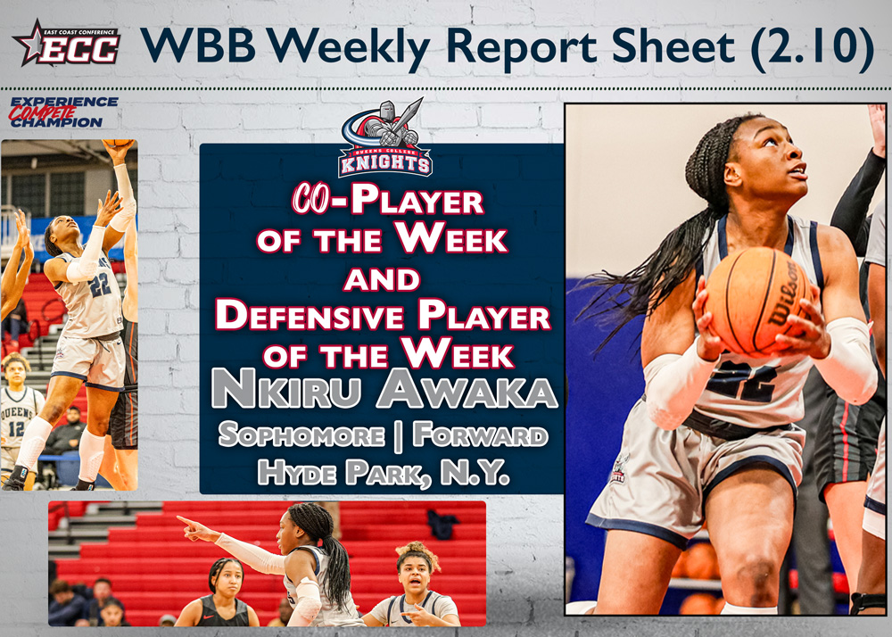 Sophomore Nkiru Awaka recorded a career-high 30 points and 23 rebounds in a dominating performance as the Queens College women’s basketball team defeated Roberts Wesleyan University last Friday, 77-66. It was a key win for the Knights, who took a one-game lead for the sixth and final East Coast Conference (ECC) playoff spot.