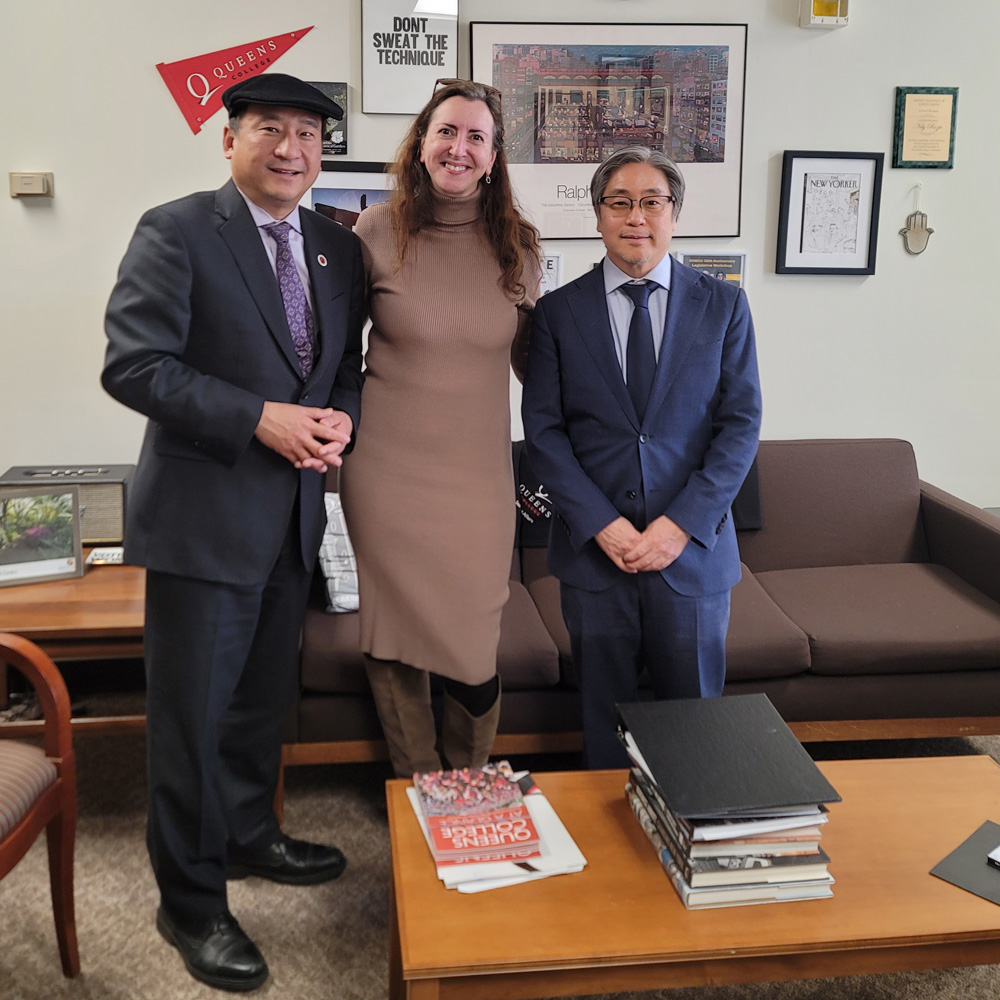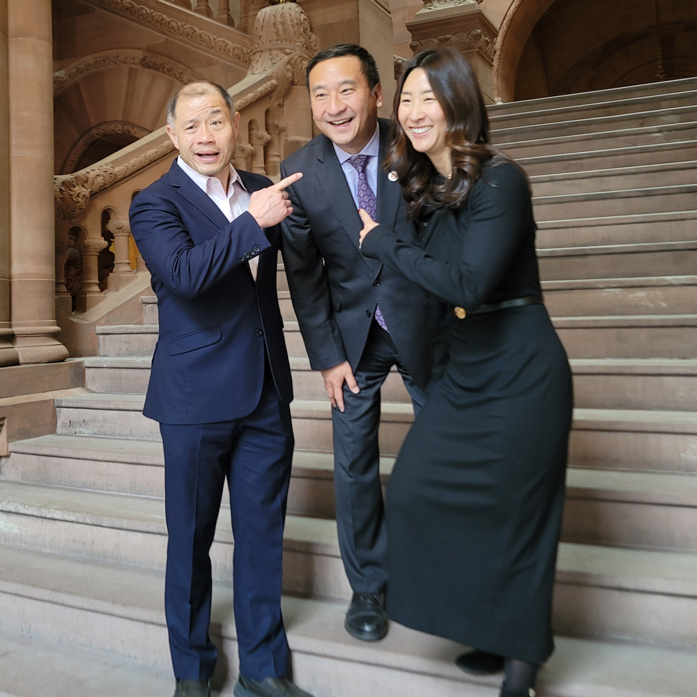President Frank H. Wu and Asian American / Asian Research Institute Interim Dean John Chin participated in the REACH Coalition’s Advocacy Day in Albany on February 11. REACH—the acronym stands for Representing and Empowering AANHPI Community History—works for the integration and implementation of Asian American and Pacific Islander curricular materials into New York State public schools’ history and social studies curricula. | From left: State Senator John Liu, President Frank H. Wu, and Assemblymember Grace Lee in the Capitol in Albany | |