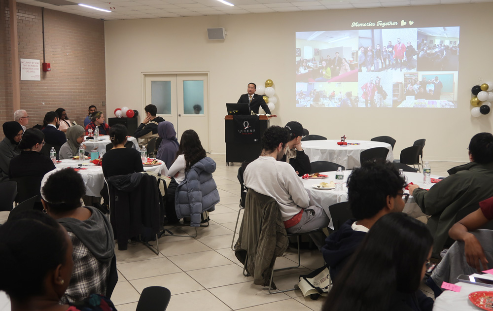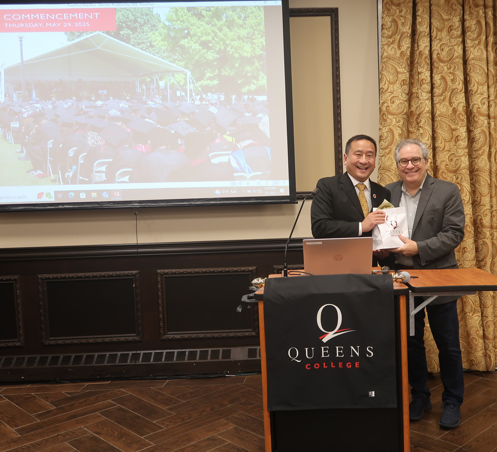 Edward Smaldone (right), chief marshal for Commencement, was recognized by President Frank H. Wu at a gathering of colleagues on Monday, May 5. | | Next, President Wu swung by the Muyskens Conference Room, where QCAP and Asian American Community Studies celebrated Asian American and Pacific Islander Heritage Month. | | He also made time to salute members of the class of 2025 at the Honors Senior Luncheon. | | Jennifer Bisram ’04 (in yellow), a CBS News New York reporter and anchor profiled in QView 196, spoke to a Media Studies class on Monday through Professionals on Campus. | | That evening, QC graduate Esther Fuchs, professor of international and public affairs and political science at Columbia University, and director of the Urban and Social Policy Program at its School of International and Public Affairs, spoke about antisemitism and the future of higher education. The well-attended lecture, based on Fuchs’s experience as co-chair of Columbia’s antisemitism taskforce, was presented by the Center for Jewish Studies and co-sponsored by Queens College Hillel, the Center for Ethnic, Racial, and Religious Understanding and the Jewish Community Relations Council (JCRC). | | Utopia Parkway, QC’s undergraduate literary journal, marked the launch of its latest issue on Tuesday, May 6. | | Jamie Klein ’79, Kenneth Newman ’67, and Howard Rose ’77 were honored at Queens College’s 34th Gala on Tuesday, May 6. Klein received the President’s Leadership Award; Newman, the Distinguished Alumni Award; and Rose, the QC Lifetime Achievement Award. Christian Mark Gibbs ’14 performed two songs before an appreciative audience. Olympics Silver Medalist Gail Marquis ’80 moderated the event. The gala was alumnus Chaim Wachsberger ’73’s first as chair of the Queens College Foundation. | From left: Vice President for Institutional Advancement/Alumni Relations Laurie Dorf, Kenneth Newman, Jamie Klein, Howard Rose, President Frank H. Wu | | CUNY Explorers X NYGU brought downstate high school students to this campus on Friday, May 9, to learn what QC and CUNY have to offer them. | | Men’s Tennis Wins NCAA East Regionals to Advance to NCAA Tournament; Women’s Tennis Looks to Do The Same | | |