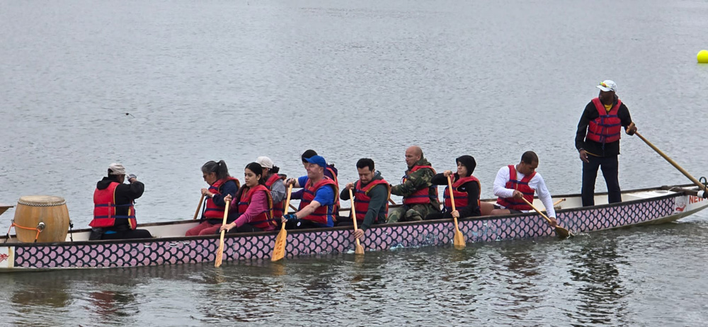“We started with two people, and little by little, more people began to learn about it, and we wound up with a team of about 18,” Marquez says, mentioning that members came from both QC and the nearby community. “None of us, other than the team captain, Lt. Hemwatie Seusarran (Public Safety), knew anything about dragon boat racing, so everybody picked up a paddle for the first time.”