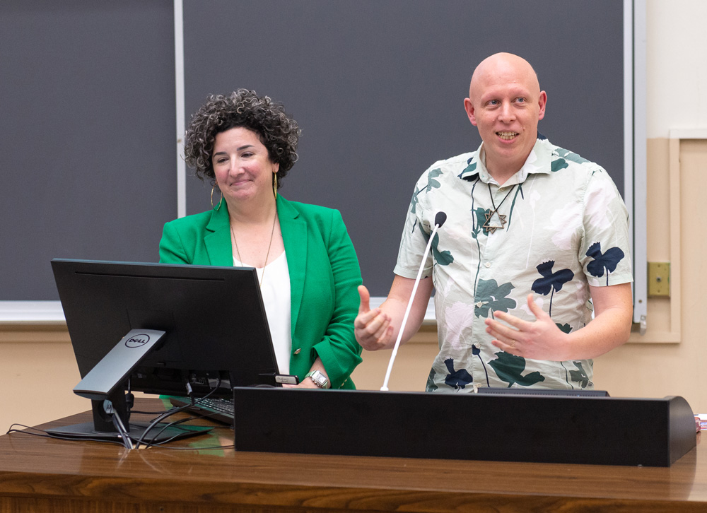 Thomas Plummer (Anthropology) was elected chair of the Academic Senate on Thursday, September 11, the first meeting of the semester. Below: Rebekkah Chow, associate provost for Institutional Effectiveness, and Christoper Hanusa (Mathematics) presented an update on preparations for the Middle States Commission on Higher Education visit later this academic year.